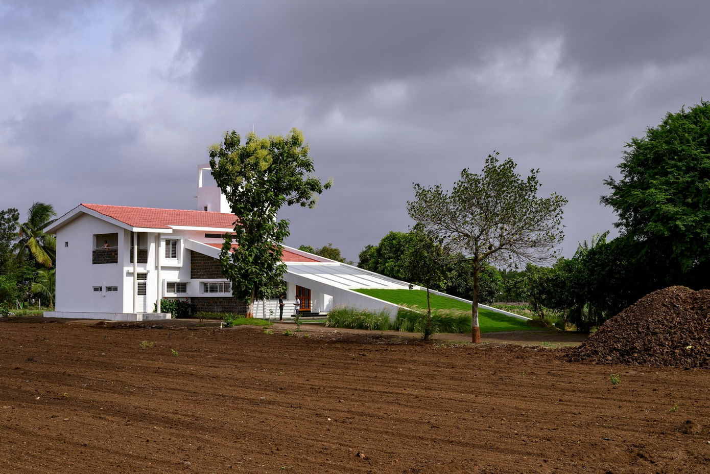 | Nhìn từ mặt tiền thẳng về phía Đông, bãi cỏ dốc dần kết nối với bóng râm của giàn che, rồi cuối cùng đạt đến đỉnh cao là mái dốc ngói Mangalore truyền thống. |