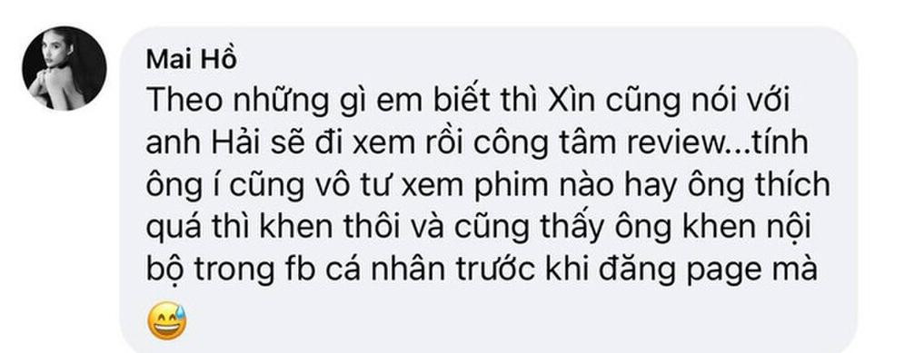 Giữa ồn ào này, Mai Hồ - người yêu cũ của Trấn Thành đã lên tiếng bênh vực. Cụ thể, cô nàng để lại bình luận: “Theo những gì em biết thì Xìn cũng nói với anh Hải sẽ đi xem rồi công tâm review... Tính ông ấy cũng vô tư, xem phim nào hay, ông thích quá thì khen thôi và cũng thấy ông khen nội bộ trong Facebook cá nhân trước khi đăng page mà".
