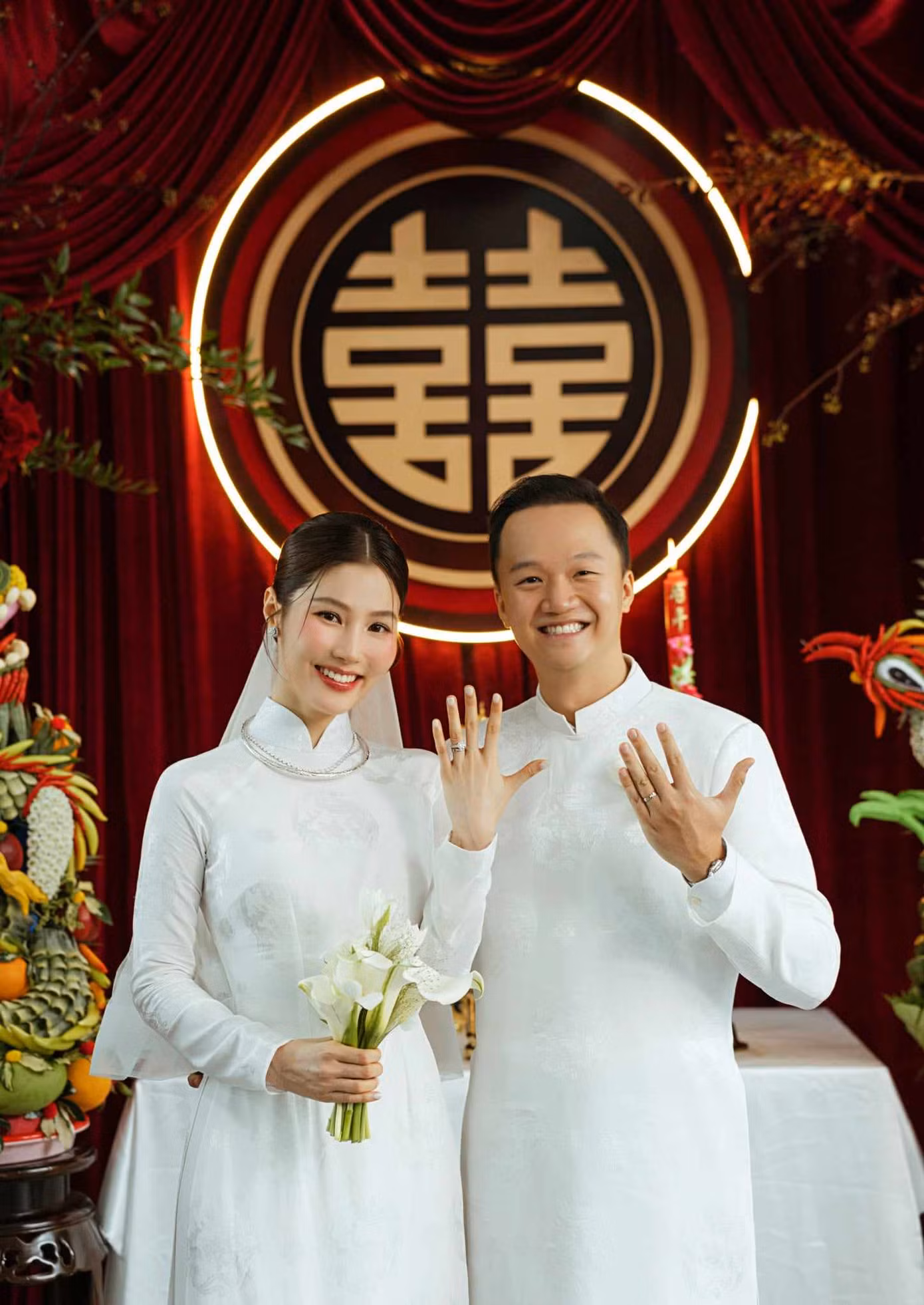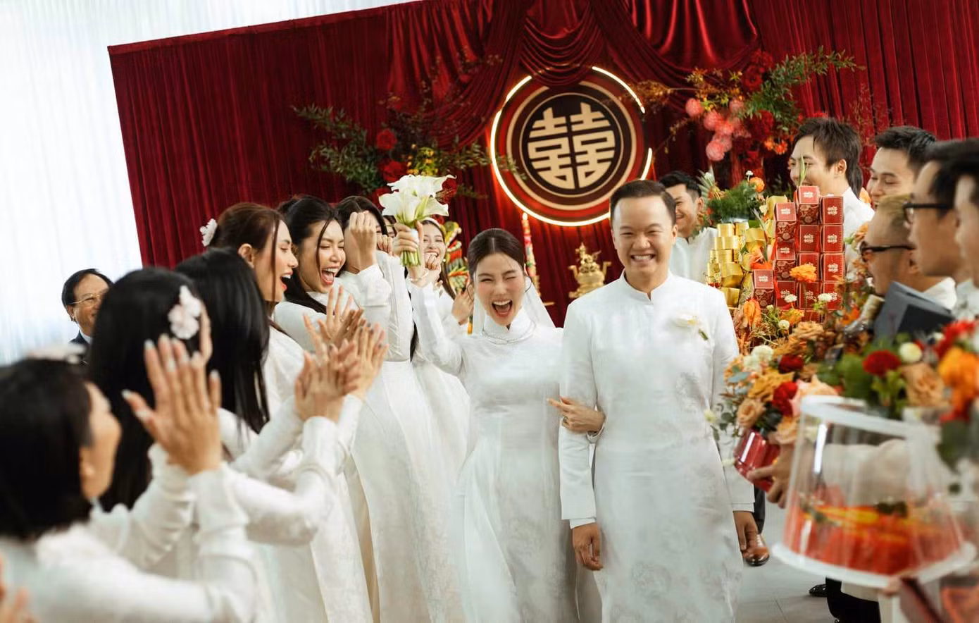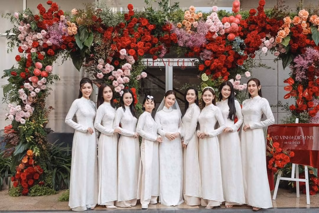 Không cầu kỳ, Diễm My 9X và dàn phù dâu đều chọn áo dài tông màu trắng trong ngày lễ trọng đại này. Cô dâu vốn sở hữu nhan sắc ưa nhìn nên việc trang điểm nhẹ nhàng, trang phục đơn giản đã giúp tôn lên vẻ đẹp vốn có của nữ diễn viên.