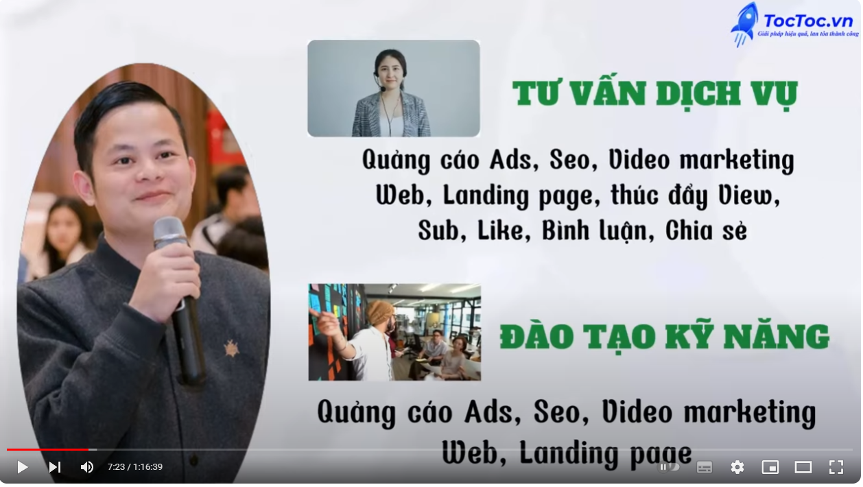 Quảng Cáo Video Youtube tạo ra chuyển đổi vô cùng to lớn, thúc đẩy view đề xuất cho video kênh, giúp kênh phát triển về lâu dài, thu hút hấp dẫn người xem hơn nhiều kênh khác. Tại toctoc.vn bạn sẽ sẽ được tư vấn, hỗ trợ chiến lược chạy quảng cáo trên Youtube giúp đạt được những mục tiêu cụ thể. Tất cả sẽ được lên kế hoạch và tối ưu hóa sao cho đạt được mục tiêu sớm nhất với chi phí tối ưu nhất và hiệu quả nhất.