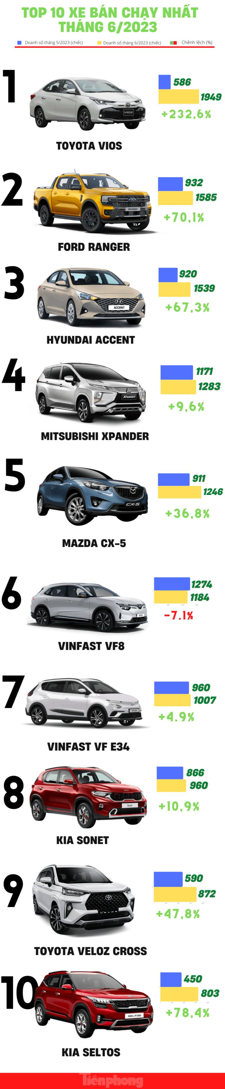 TPO - Sau khi trình làng phiên bản mới, Toyota Vios trở thành mẫu xe bán chạy nhất trong tháng 6 vừa qua. Ford Ranger vẫn hấp dẫn nhiều khách hàng với mức tăng trưởng hơn 70% so với tháng 5, tương ứng 1.585 xe bán ra.
