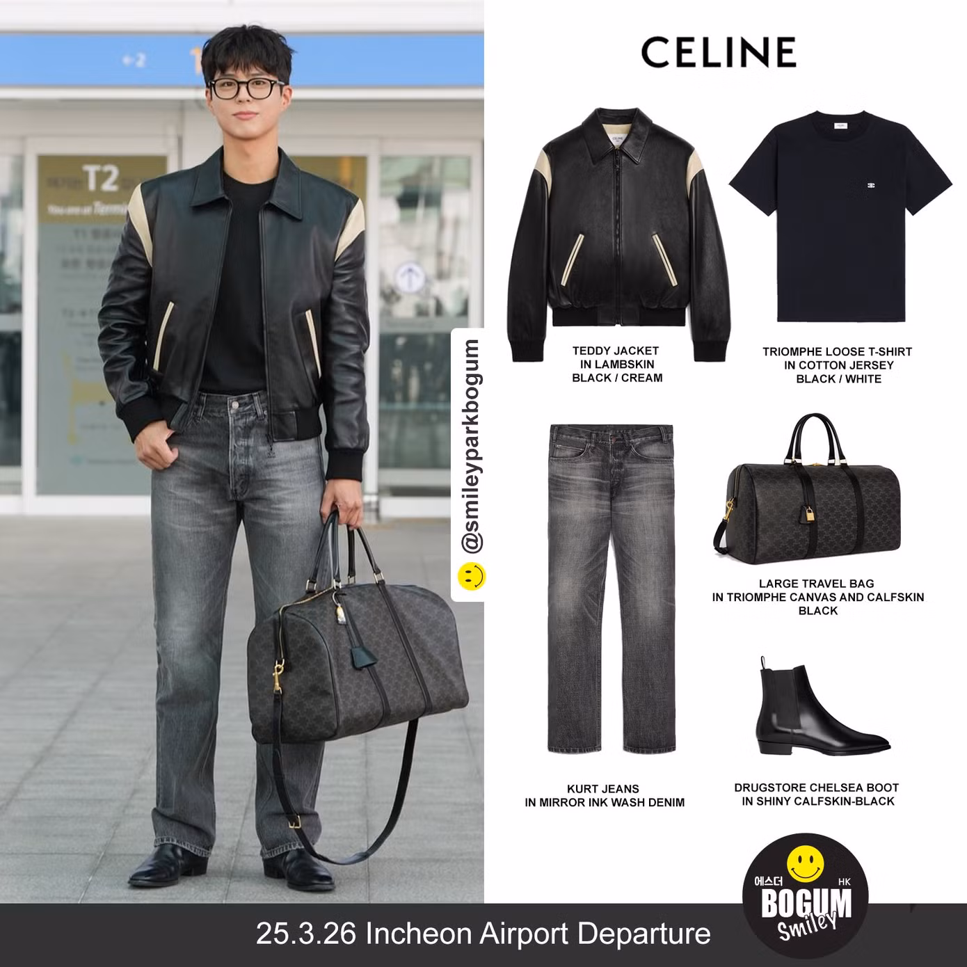 Trước đó tại sân bay khởi hành, nam đại sứ sinh năm 1993 gây ấn tượng với bản phối tông đen gồm quần jeans, áo khoác da, giày chelsea boots, túi du lịch cỡ lớn tạo nên tổng thể năng động, bụi bặm cho Park Bo Gum.