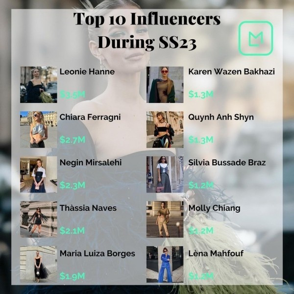 Ở mùa mốt Xuân Hè 2023, Quỳnh Anh Shyn tham dự Milan & Paris Fashion Week, tạo ra giá trị truyền thông lên đến 1,3 triệu USD (gần 34 tỷ đồng). Quỳnh Anh Shyn thuộc Top 10 influencers có chỉ số MIV cao nhất trong khuôn khổ Fashion Week ở 4 quốc gia New York, Milan, Paris và London.