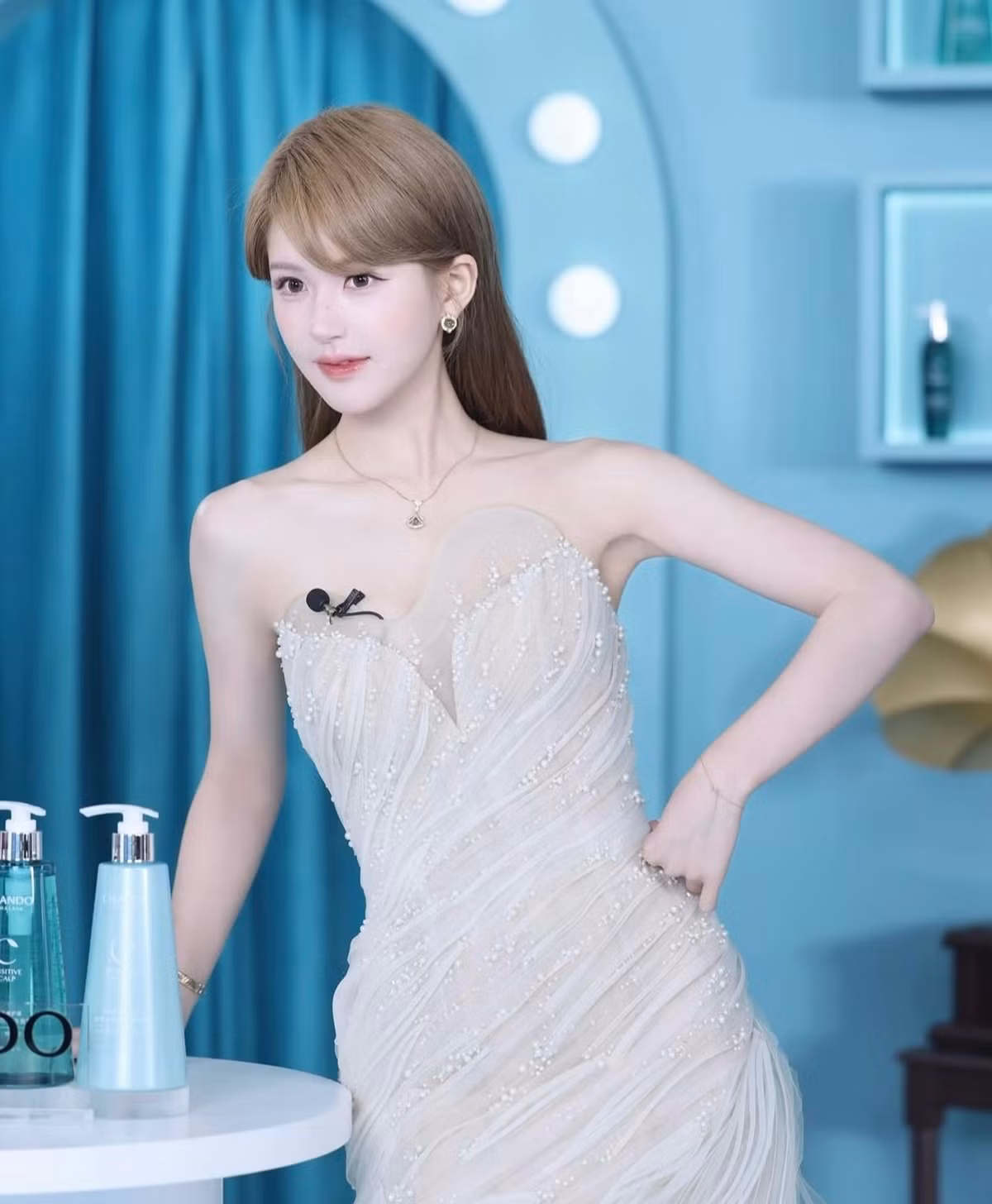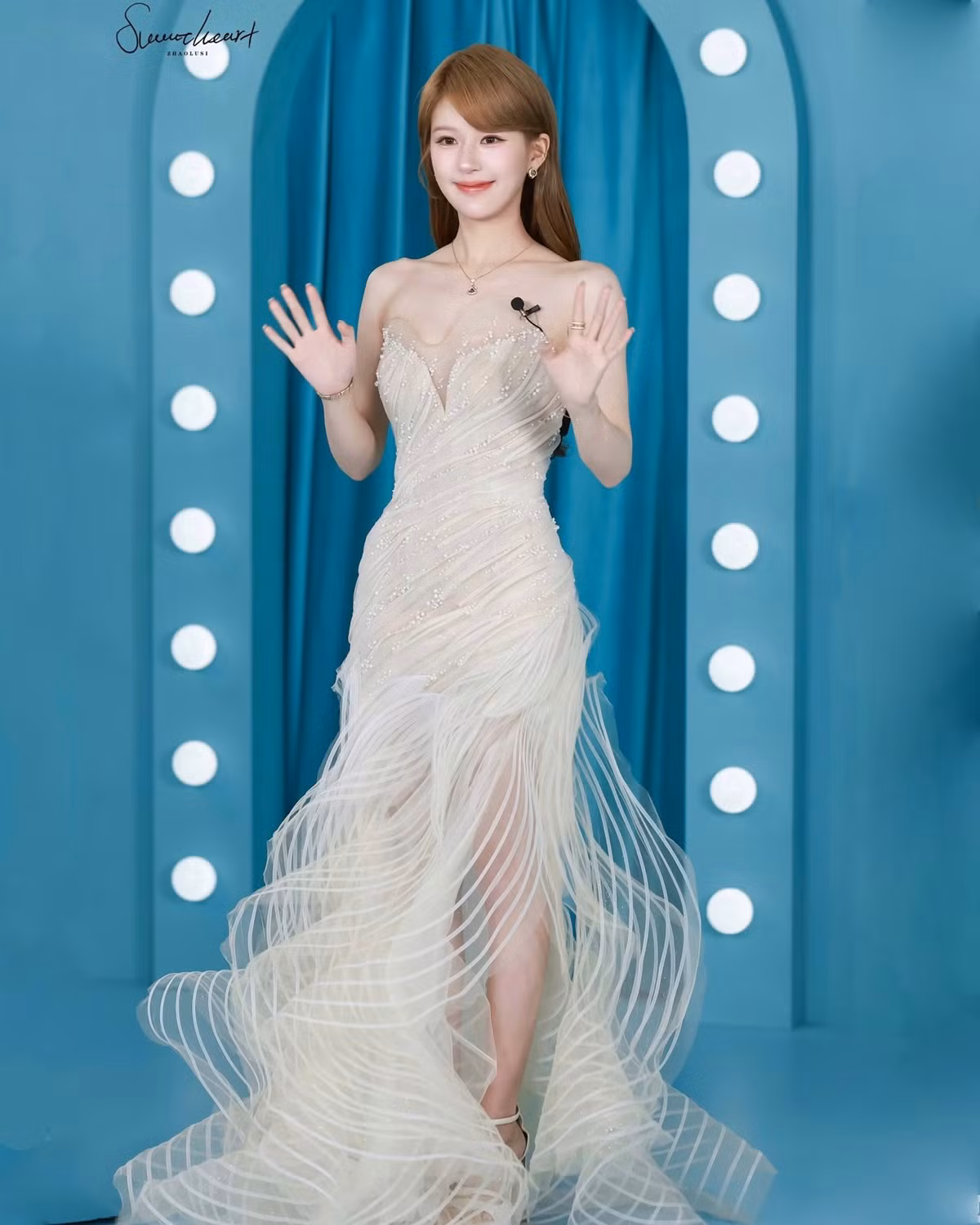 Ở lần tái xuất này, nữ diễn viên mang đến diện mạo rạng rỡ, sáng bừng xinh như công chúa, cho thấy hình ảnh và tinh thần khỏe khoắn hơn. Triệu Lộ Tư xuất hiện với chiếc váy cao cấp trắng muốt đến từ thương hiệu Hacchic Couture, phối cùng trang sức đắt giá của Bulgari.
