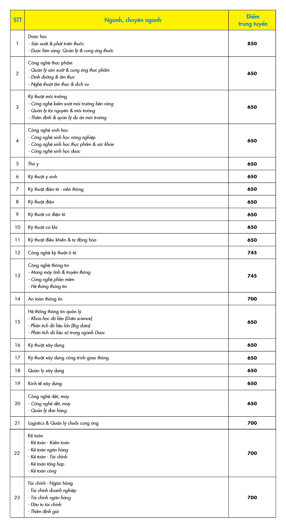 Theo đó, Trường Đại học Công nghệ TPHCM có điểm trúng tuyển các ngành dao động từ 650 điểm đến 850 điểm. Ngành Dược có điểm trúng tuyển cao nhất: 850 điểm (với mức điểm xét tuyển ban đầu là 750 điểm).