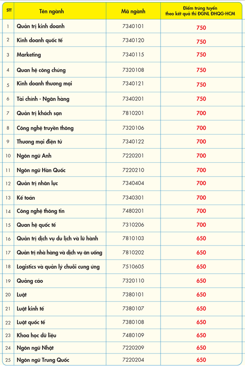 Các ngành có mức điểm trúng tuyển 700 gồm Quản trị khách sạn, Thương mại điện tử, Ngôn ngữ Anh, Ngôn ngữ Hàn Quốc, Quản trị nhân lực, Kế toán, Công nghệ thông tin, Công nghệ truyền thông, Quan hệ quốc tế. Còn lại, 11 ngành có mức điểm trúng tuyển 650.