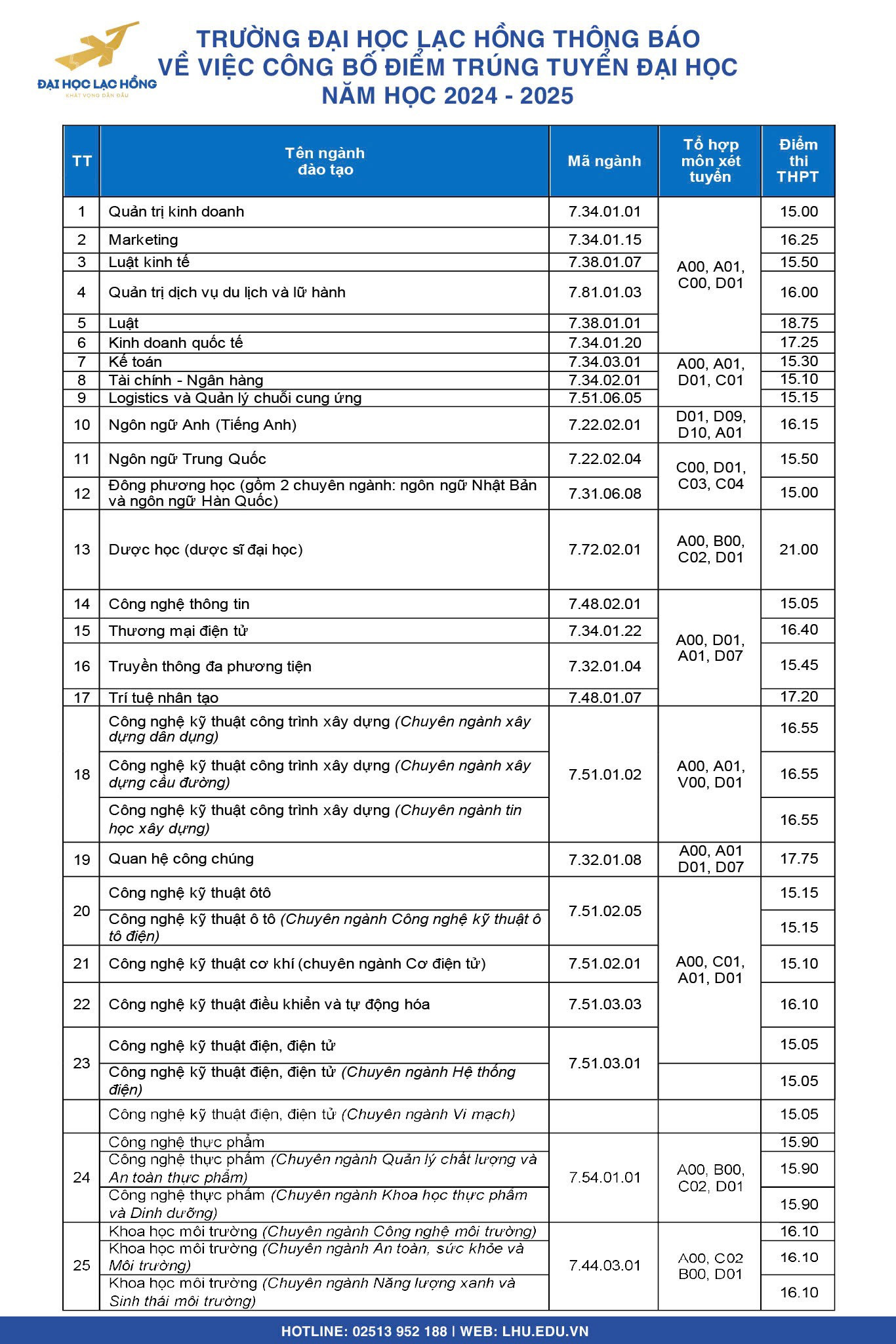 Tại Trường ĐH Lạc Hồng, điểm chuẩn dao động từ 15 đến 21 điểm. Điểm chuẩn các ngành như sau:
