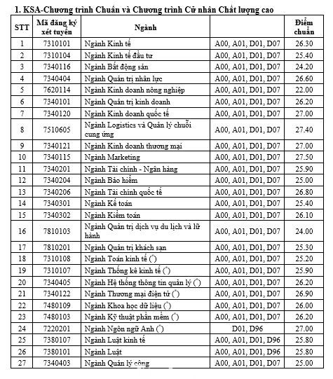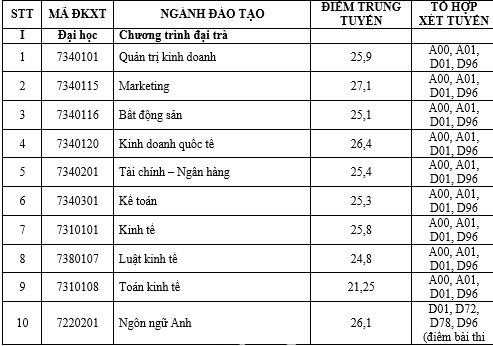 Theo đó, ngành có điểm chuẩn cao nhất là Marketing (chương trình Chuẩn và Chất lượng cao) và ngành Kinh doanh quốc tế (chương trình cử nhân tài năng) với số điểm 27.5. Ngành thấp nhất là Kinh doanh nông nghiệp với 22 điểm. Một số ngành có điểm chuẩn năm nay tăng cao so với năm 2020 như Thương mại điện tử hay ngành Bảo hiểm (tăng 3 điểm).