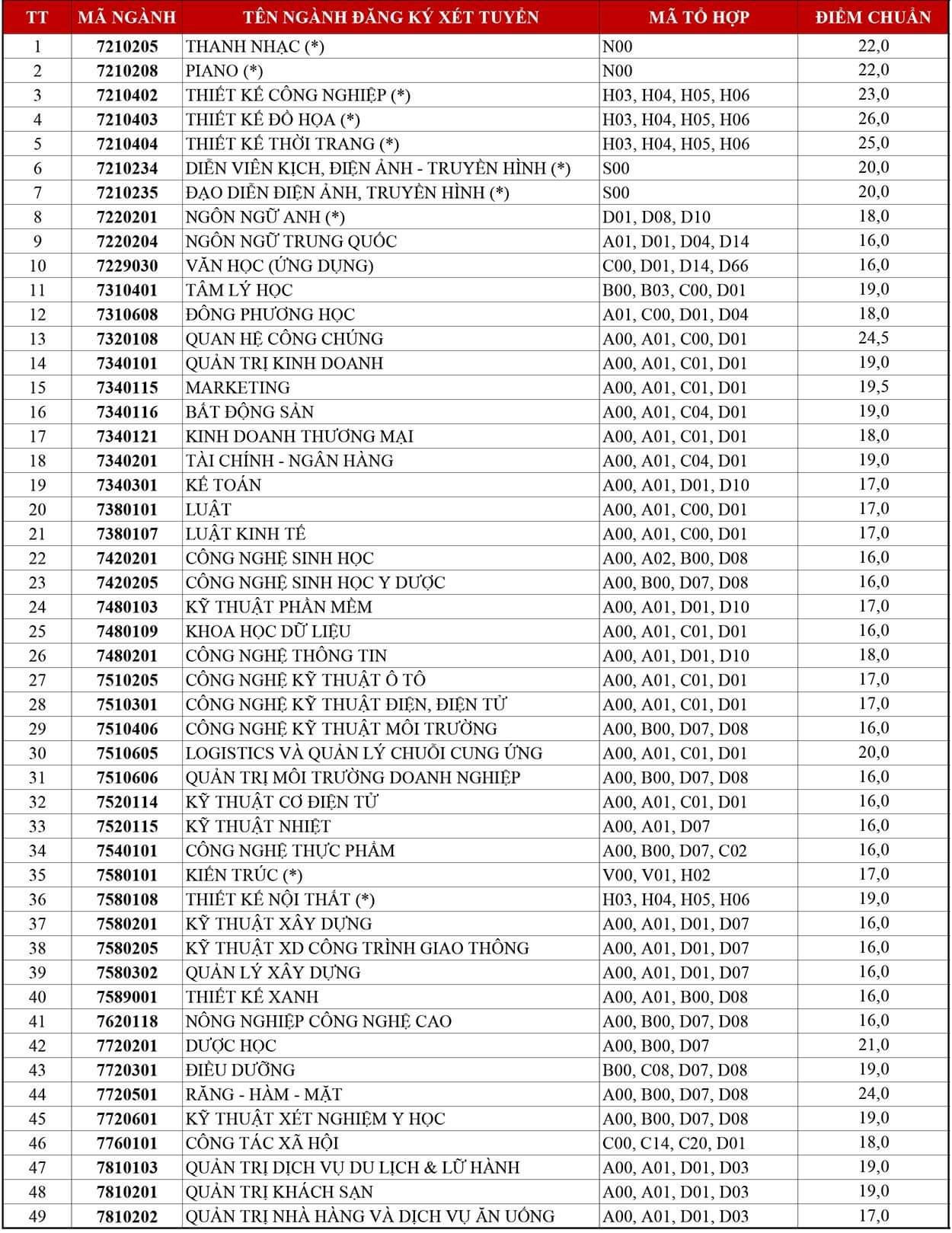 Mức điểm chuẩn trúng tuyển cho 49 ngành của trường dao động từ 16 - 26 điểm. Trong đó nhóm ngành có điểm cao là: Thiết kế Đồ họa có điểm chuẩn cao nhất (26 điểm), ngành Thiết kế Thời trang (25 điểm), ngành Quan hệ công chúng (24,5 điểm),...