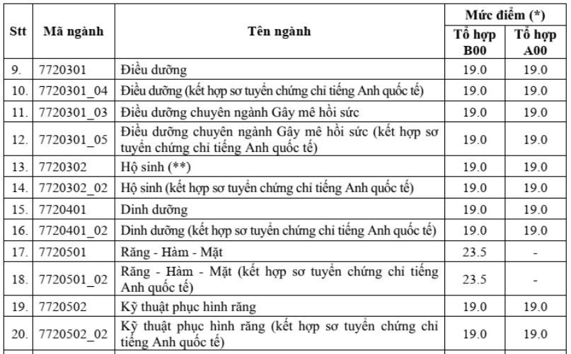 Đáng chú ý, ở tổ hợp B00, hai nhóm ngành có điểm sàn cao nhất là y khoa và răng hàm mặt với 23,5 điểm, tăng hơn năm trước 0,5 điểm và cao hơn mức sàn của Bộ GD&ĐT đến 1 điểm.