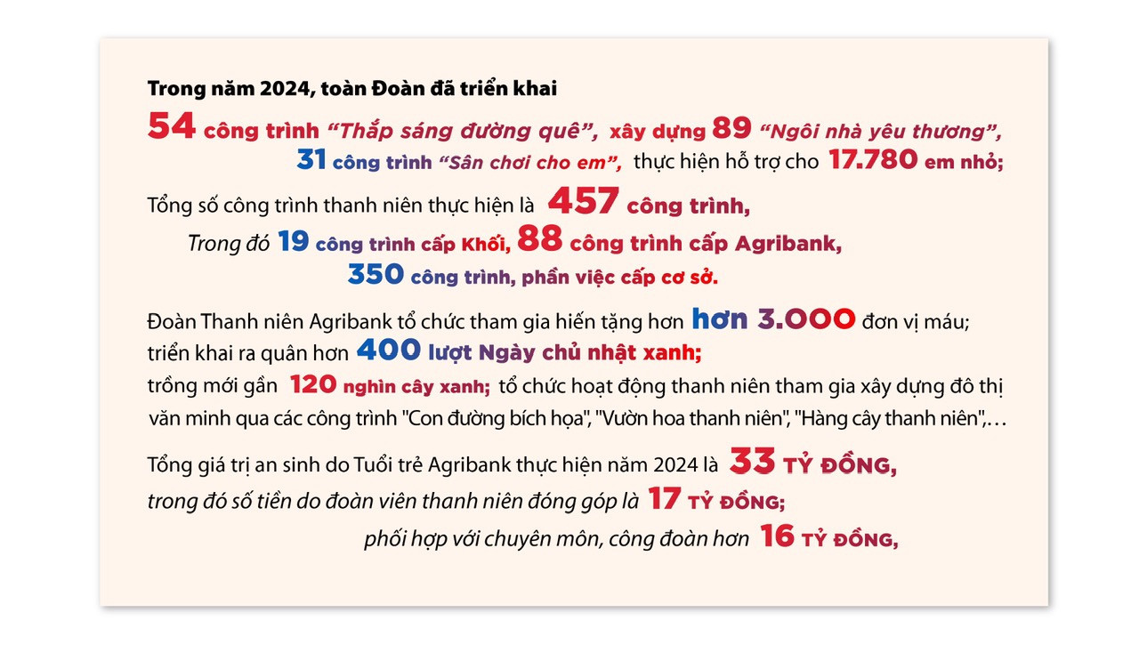 Năm 2024 đã chứng kiến sự phát triển toàn diện của thế hệ trẻ Agribank trên mọi mặt công tác. Đoàn Thanh niên Agribank đã vinh dự được Đảng ủy, lãnh đạo Agribank tin tưởng, giao nhiều nhiệm vụ quan trọng và đã đồng tâm hiệp lực, hoàn thành xuất sắc nhiều nhiệm vụ được giao. Với 182 cơ sở Đoàn trực thuộc (gồm 142 Đoàn cơ sở và 40 Chi đoàn cơ sở trực thuộc), gần 15.000 đoàn viên, thanh niên trên toàn hệ thống, mô hình Đoàn Thanh niên Agribank tương đương cấp huyện, trực thuộc Đoàn khối Doanh nghiệp Trung ương (DNTW), là lực lượng tiên phong, xung kích, đội dự bị tin cậy của Đảng, góp phần vào sự phát triển chung của toàn hệ thống Agribank.