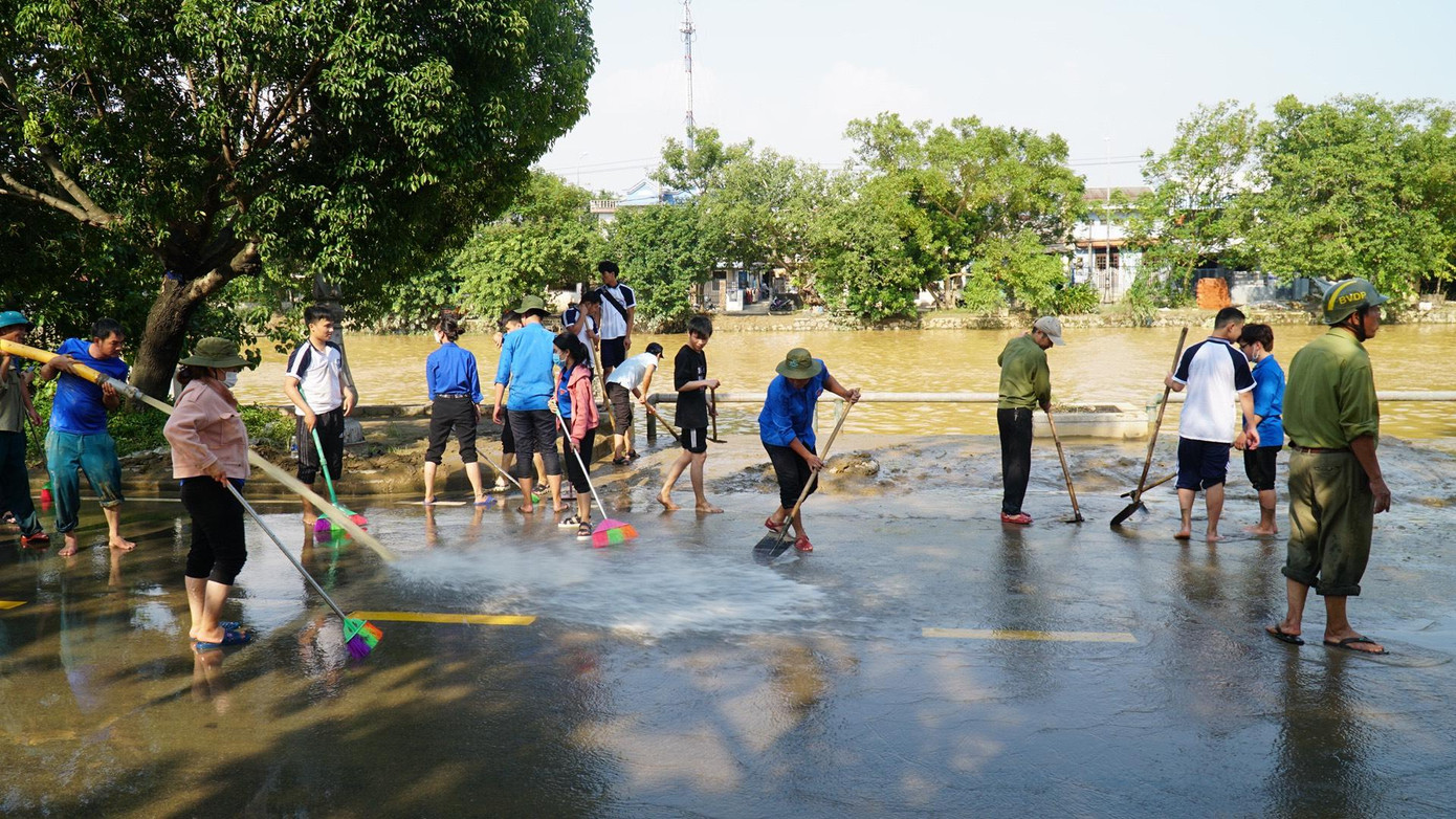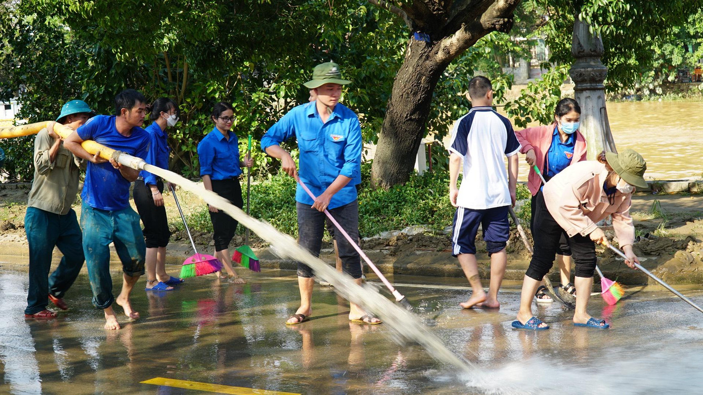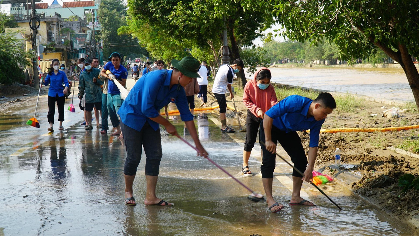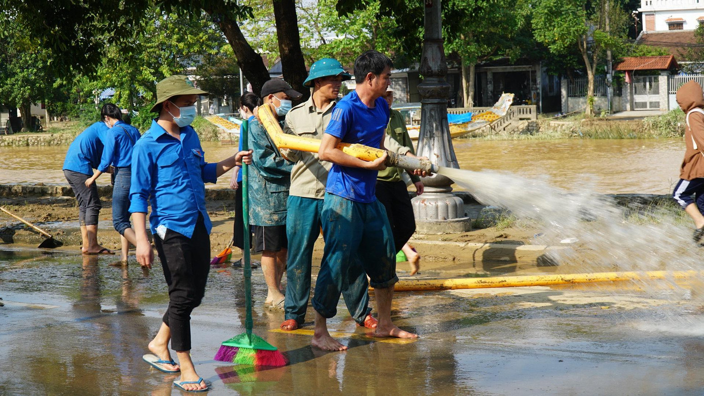 | Nước lũ rút đến đâu, công tác dọn vệ sinh của đoàn viên, thanh niên được tiến hành đến đó. Ản: N.V |