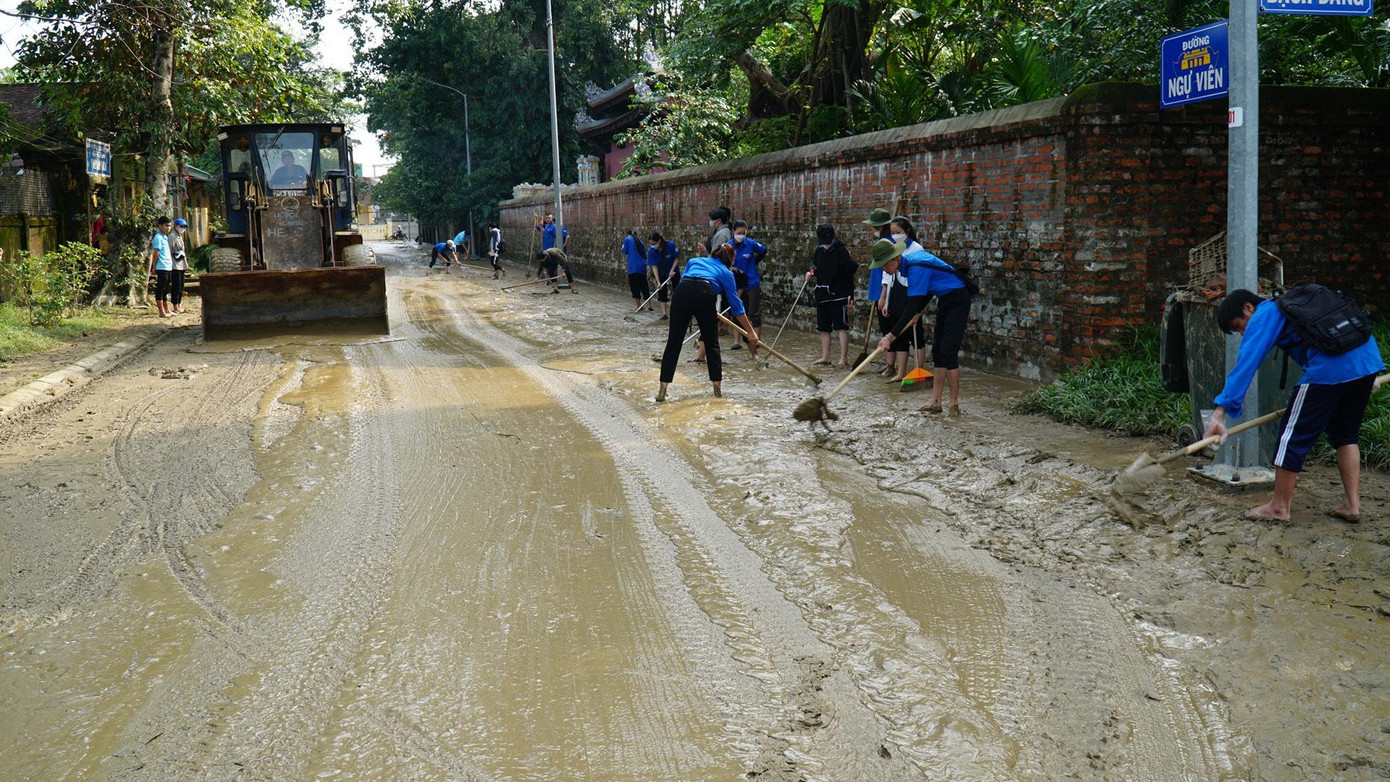 | Lực lượng sinh viên cùng tham gia dọn bùn, làm sạch phố phường, bảo đảm an toàn giao thông đi lại và mỹ quan đô thị. Ảnh: N.V |