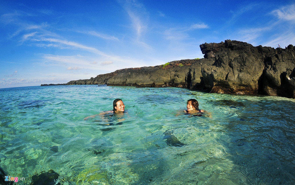 Du khách tắm biển bên trầm tích núi lửa hàng triệu năm ở đảo Bé Lý Sơn. Tiến sĩ Nguyễn Ngọc Thu, nguyên Giám đốc Trung tâm Địa Đật lý - Liên đoàn Bản đồ địa chất miền Nam, cho rằng trầm tích núi lửa tạo nên nhiều cảnh quan độc đáo cho vùng biển Bình Châu - Lý Sơn.