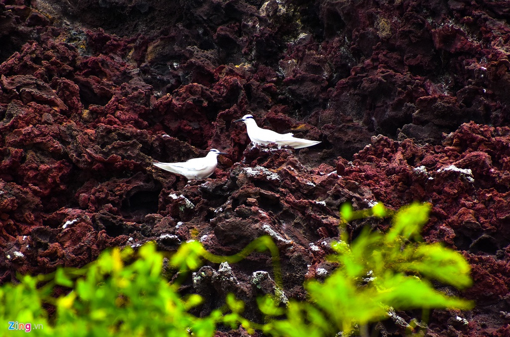 Đôi chim bồ câu về tổ trên vách đá trầm tích núi lửa ở huyện đảo Lý Sơn.