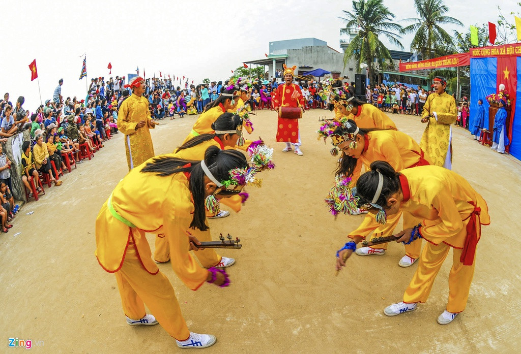 Các ngư dân trong trang phục rực rỡ hát sắc bùa trong lễ hội cầu ngư đầu xuân mới ở làng chài Sa Huỳnh. Tháng 11/2019, Quảng Ngãi đã trình hồ sơ dự án công viên địa chất Lý Sơn - Sa Huỳnh đến UNESCO để xem xét, công nhận là Công viên địa chất toàn cầu.