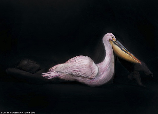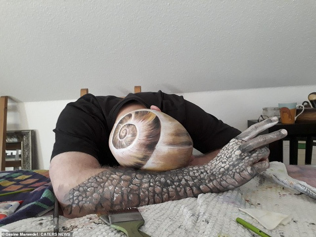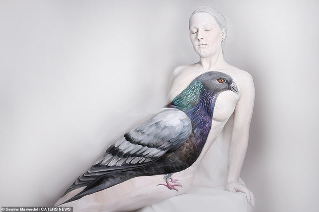 Gesine Marwedel (33 tuổi), là nghệ sĩ body-painting đang mang bầu đến từ Đức. Mới đây cô đã thực hiện bộ ảnh biến cơ thể của mình trong thời kỳ mang bầu trở thành những bức tranh sinh động khắc họa các loài động vật.