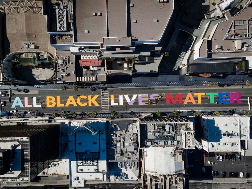 Một bức ảnh được chụp bởi thiết bị chụp ảnh trên không, cho thấy mọi người đang vẽ một bức tranh tường “All Black Lives Matter” trên Đại lộ Hollywood. (Ảnh: Christian Monterrosa / EPA).