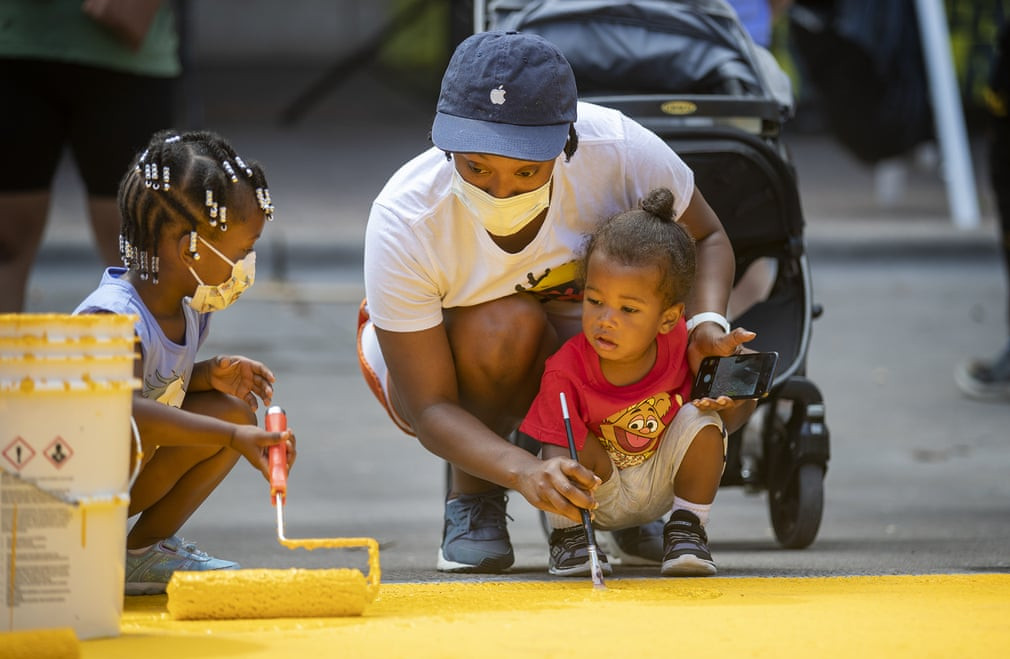 Kimberly McCarver cùng các con của cô - Peyton và Dillion McCray tham gia vẽ ủng hộ phong trào biểu tình chống phân biệt chủng tộc 'Black Austin Matters' ở trung tâm thành phố Austin (Ảnh: Ricardo B Brazziell / AP).