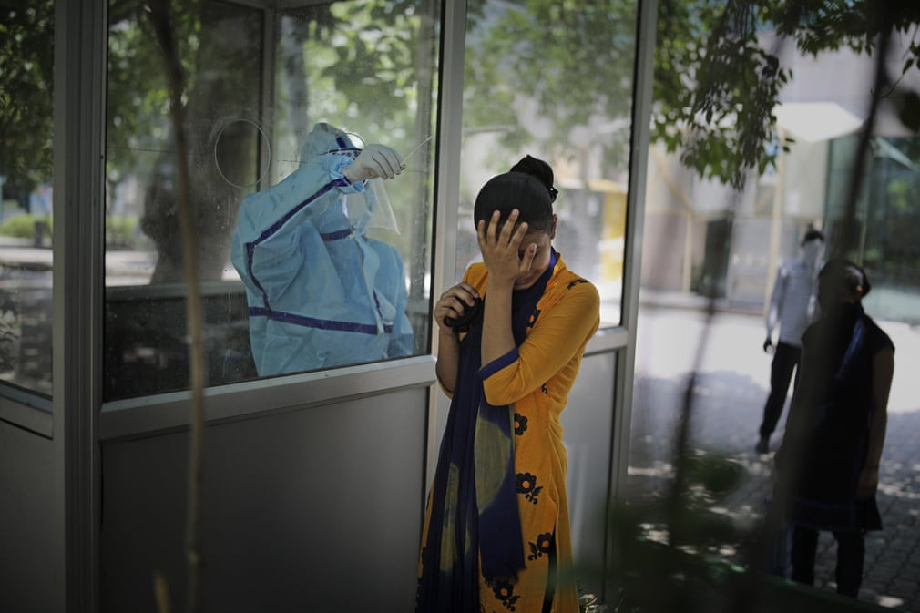 Phản ứng của một người phụ nữ sau khi được kiểm tra virus Corona ở Noida, ngoại ô New Delhi. (Ảnh: Altaf Qadri / AP).