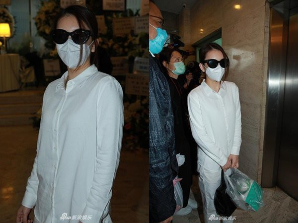 Bà xã Quách Phú Thành - Phương Viện cũng bịt mặt kín mít xuất hiện trong tang lễ.