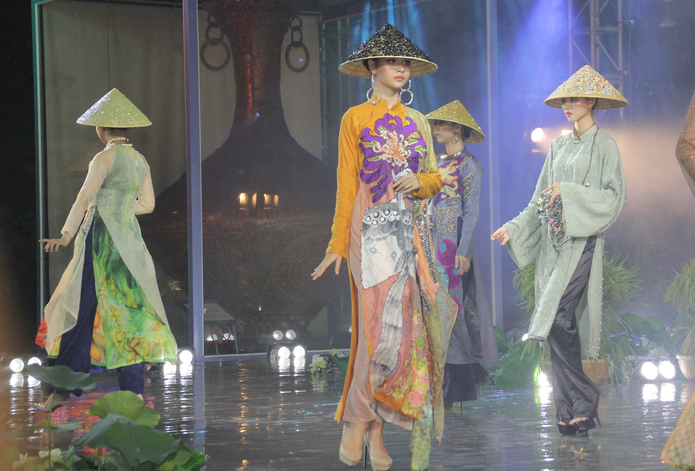 Dù gặp phải cơn mưa nhỏ, những người mẫu vẫn cố gắng thể hiện phần trình diễn cùng áo dài của mình trên sân khấu ngoài trời