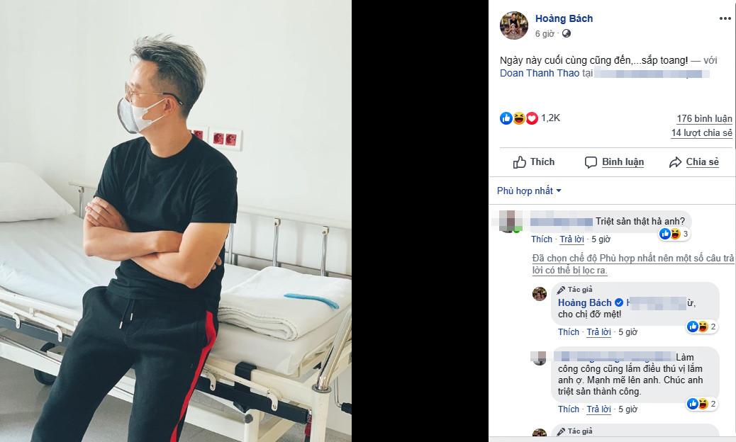 Theo đó, mới đây Hoàng Bách chia sẻ hình ảnh nằm trong bệnh viện và dí dỏm chú thích: “Ca mổ thành công...Bách sẽ trở lại và lợi hại hơn xưa”. Trước đó anh cũng đăng ảnh ngồi trong bệnh viện và viết: "Ngày này cuối cùng cũng đến, sắp toang". Trong phần bình luận, khi một người bạn hỏi: “Triệt sản thật hả anh?” thì Hoàng Bách xác nhận: “ừ, cho chị đỡ mệt!”.
