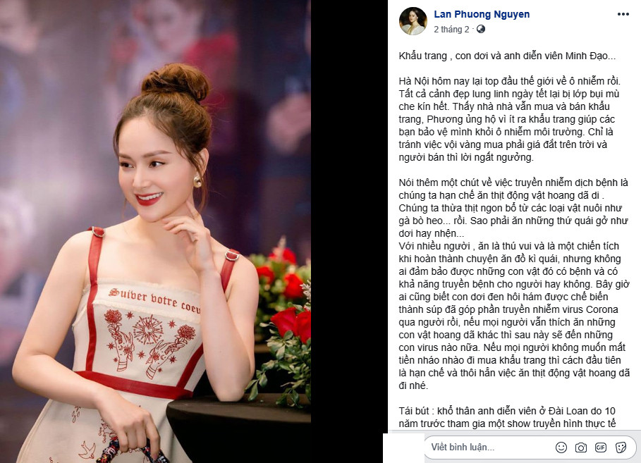 Cụ thể, diễn viên phim “Cả một đời ân oán” viết: “Khổ thân anh diễn viên ở Đài Loan…Có phải lỗi anh ấy đâu, lỗi là ở những người sản xuất ra chương trình và thử thách anh ấy ăn món dơi mà. Là nghệ sỹ, ai tham gia gameshow chẳng phải cố gắng hoàn thành thử thách của mình chứ. Mọi người đang lo lắng hoang mang vì dịch bệnh nên cứ thấy một ai có chút liên quan là tóm lấy trách tội để trút hết sự hoang mang lo sợ của mình. Nhưng làm vậy thật tội nghiệp và không công bằng cho anh ý”.