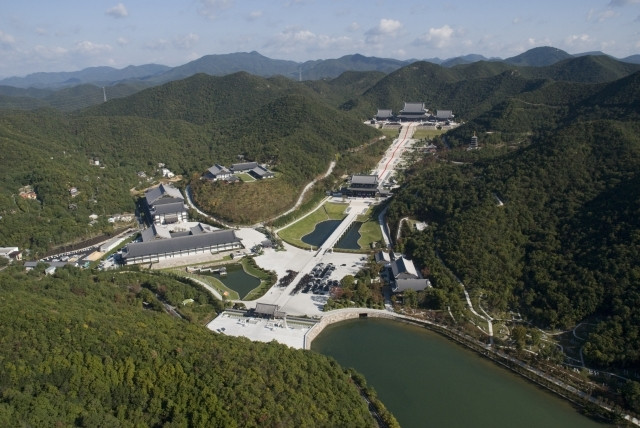 Gần đó là một bảo tháp 5 tầng, cao 32,7m, kết cấu bằng gỗ với màu ngũ sắc được vẽ từ tay của 30 nghệ nhân Hàn Quốc, trong vòng hai năm mới hoàn thành.