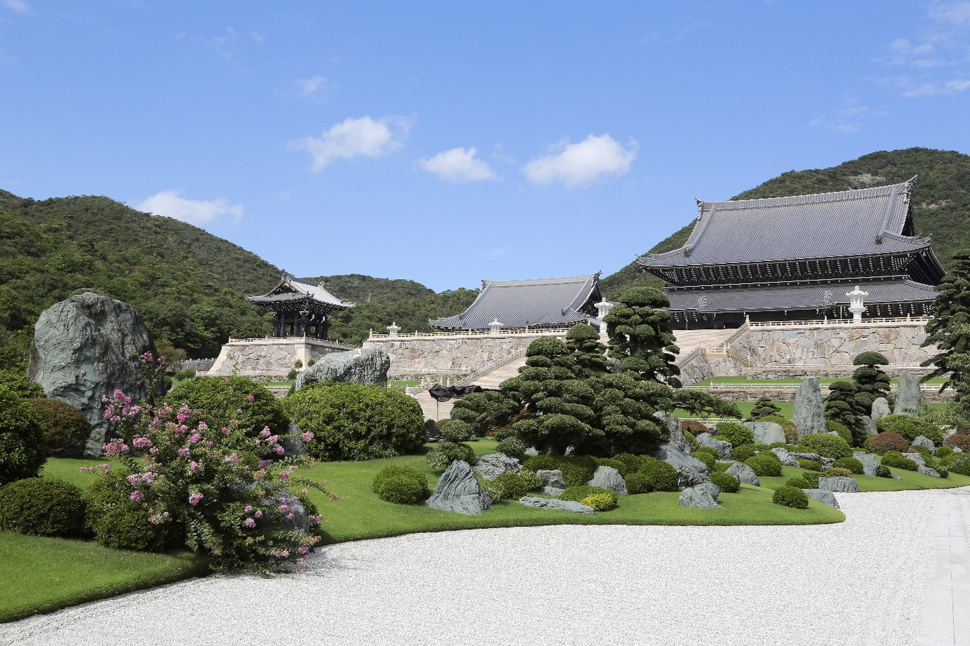 Giấc mộng của Hòa thượng Tiến Sỹ Enshinjoh đã trở thành hiện thực. Sau 7 năm xây dựng với lực lượng kiến trúc sư, kỹ sư, nghệ nhân,công nhân v.v... của Nhật Bản, Hàn Quốc và Trung Quốc làm việc miệt mài không kể ngày đêm. Đây một ngôi chùa Phật Giáo lớn nhất Nhật Bản, với nhiều công trình được sách kỷ lục thế giới UNESCO ghi nhận: đôi đèn bằng đá cao 12m trước chính điện, đỉnh chóp nóc chùa lớn nhất với 9m bề cao và 8,8m bề rộng.