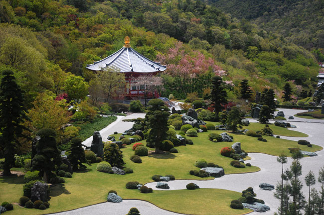 Cảnh trí quanh chùa là những hoa viên hữu tình, rộng bát ngát. Đây là những hoa viên Nhật Bản đẹp nhất trên thế giới với nhiều giống cây hiếm quý. Trong đó có những cây cổ tùng 800 năm tuổi. Khu Công viên Ngũ Bách La Hán được trang trí 500 tượng đá A La Hán bằng kích cỡ người thật. Công viên này cũng có thể nói là độc nhất vô nhị hiện nay.
