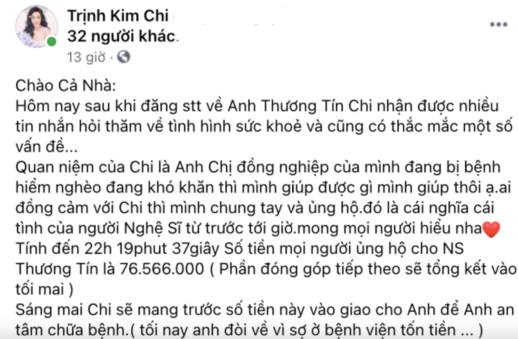 Chi Bùi Kim CHi bên giường bệnh. Riêng Á hậu - NSƯT Trịnh Kim Chi, với vai trò Phí chủ tịch Hội Sân khấu TPHCM đã tổ chức vận động các anh em nghệ sỹ cùng quyên góp cho Thương Tín và số tiền chị nhận được đã lên tới gần 80 triệu đồng. Kim Chi cho biết chị sẽ công bố toàn bộ số tiền, tên từng người ủng hộ trên Facebook cá nhân.
