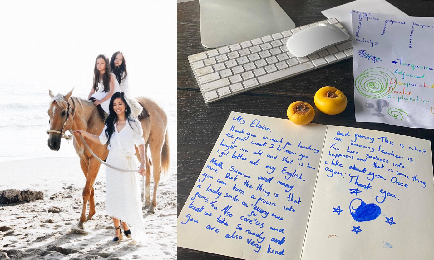 Diva Hồng Nhung đăng hình hai con kèm tấm thiệp chúc mừng cô giáo của hai bé. Cô viết: "Gia đình Bống - Tôm - Tép xin kính chúc sức khoẻ và hạnh phúc các thầy cô giáo yêu quý. Xin được mượn thư Tép gửi cô giáo mình thay lời cho cả nhà ạ!. Gửi cô Elaine, con cám ơn cô đã dạy con từ tuần 1 đến giờ. Cô dạy con thật nhiều và giúp con tiến bộ môn tiếng Anh, toán, khoa học và nhiều môn khác. Nhưng điều quan trọng là cô biến các khuôn mặt nhăn của chúng con thành mặt cười. Cô quan tâm và đối xử với chúng con thật nhẹ nhàng. Cô tốt bụng và hài hước. Điều này khiến cô là cô giáo tuyệt vời nhất! Và một lần nữa, con yêu nhất ở cô là cô biến cái buồn thành cái vui. Con cám ơn cô! Lea".