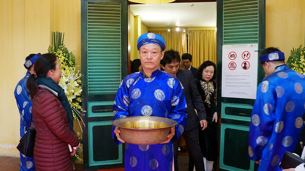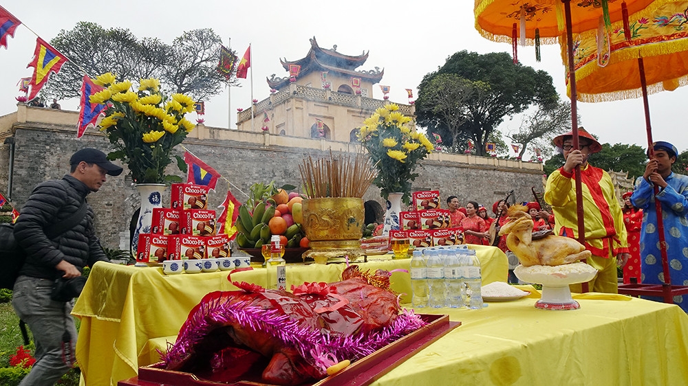 Rước cá chép từ khu điện thờ trong khu Cấm thành sau khi hành lễ