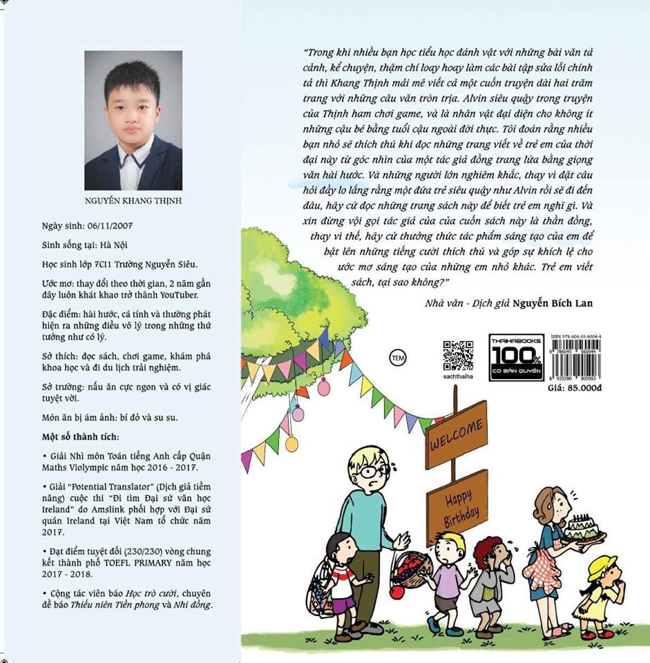 Tác giả nhí Khang Thịnh (06/11/2007) năm nay mới 13 tuổi. Em có một gia đình hạnh phúc và một người mẹ có tấm lòng nhân ái tuyệt vời. Hai anh em Khang Thịnh từ nhỏ thường theo mẹ đi làm từ thiện vào các ngày cuối tuần. Ba mẹ con thăm và tặng quà các em bé bị bỏng nặng ở Viện bỏng quốc gia, dạy học cho các em bé ở trại trẻ mồ côi Hà Cầu (Hà Đông). Chính những việc làm nhân ái này của mẹ đã giúp Khang Thịnh sớm biết chia sẻ yêu thương với mọi người xung quanh. Nhân vật Alvin hiện lên trong truyện “Nhật ký của nhóc Alvin siêu quậy” là một cậu bé như thế. Alvin rất hay trò chuyện và giúp đỡ một ông già cô đơn mà sau này, khi ông mất đi, Alvin mới biết được đó chính là một tỷ phú.