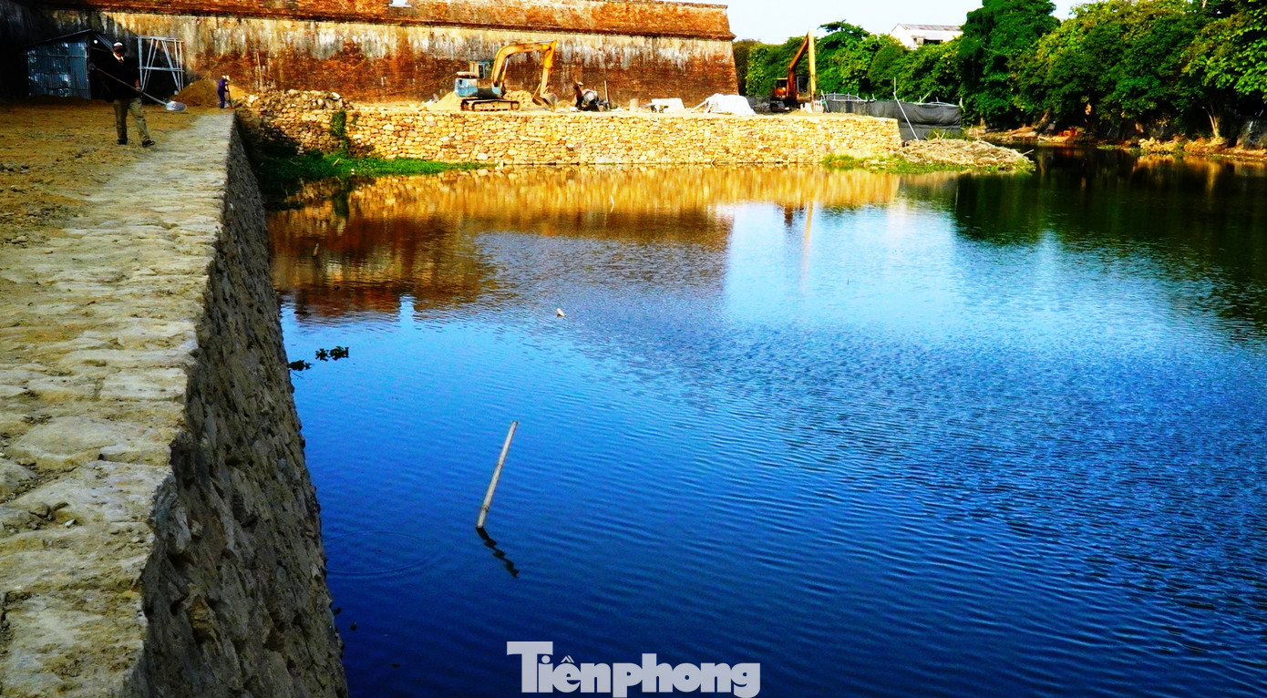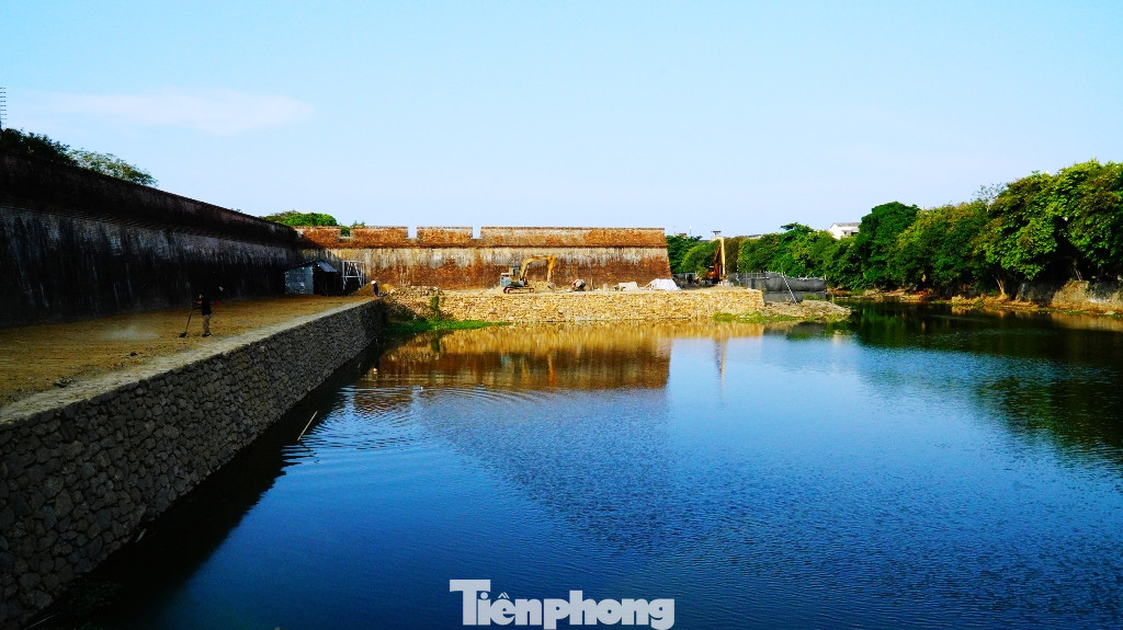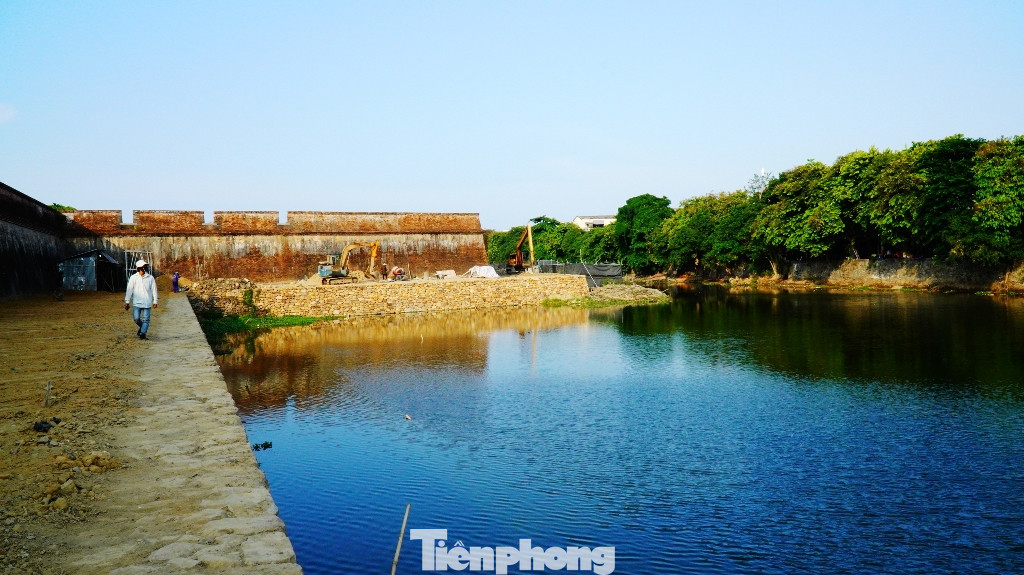 Tại đây, điều kiện thi công diễn ra hết sức phức tạp, công trình phải bố trí đê quai để hút cạn nước Hộ Thành hào, sau đó đổ móng bê tông âm dưới mặt hào, trong điều kiện bùn lầy, mặt bằng chật hẹp. (Ảnh do Trung tâm BTDTCĐ Huế cung cấp)