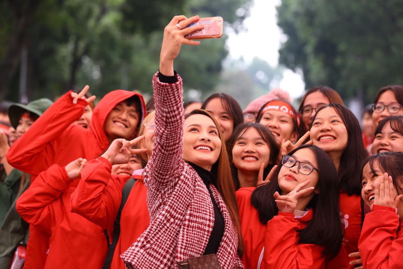 Bảo Thanh thân thiện, hào hứng chụp ảnh cùng các bạn sinh viên tới tham gia hiến máu.