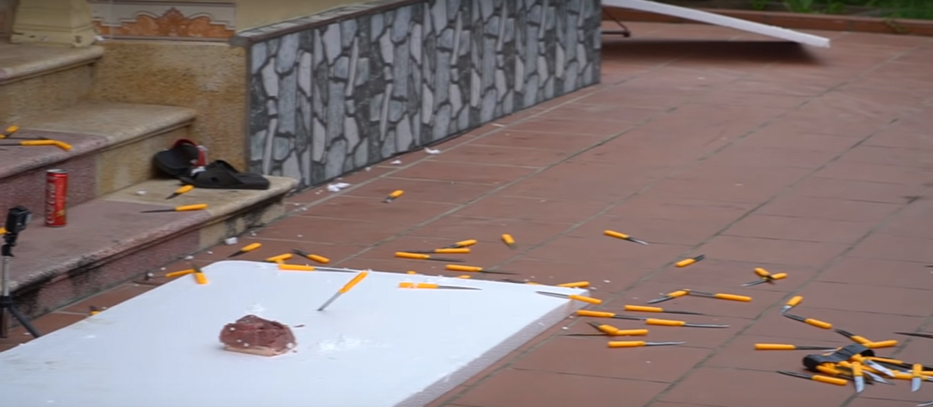 Theo đó, trong video NTN giới thiệu mua 100 con dao Thái Lan Kiwi rồi leo lên tầng thượng của ngôi nhà để thả bó dao được quấn lỏng lẻo bằng keo điện xuống đất với mục đích là bó dao này khi rơi xuống sẽ trúng miếng thịt lợn. Sau một ngày đăng tải, video nhận được hơn 1,6 triệu lượt xem và lọt vào top 34 của tab thịnh hành.