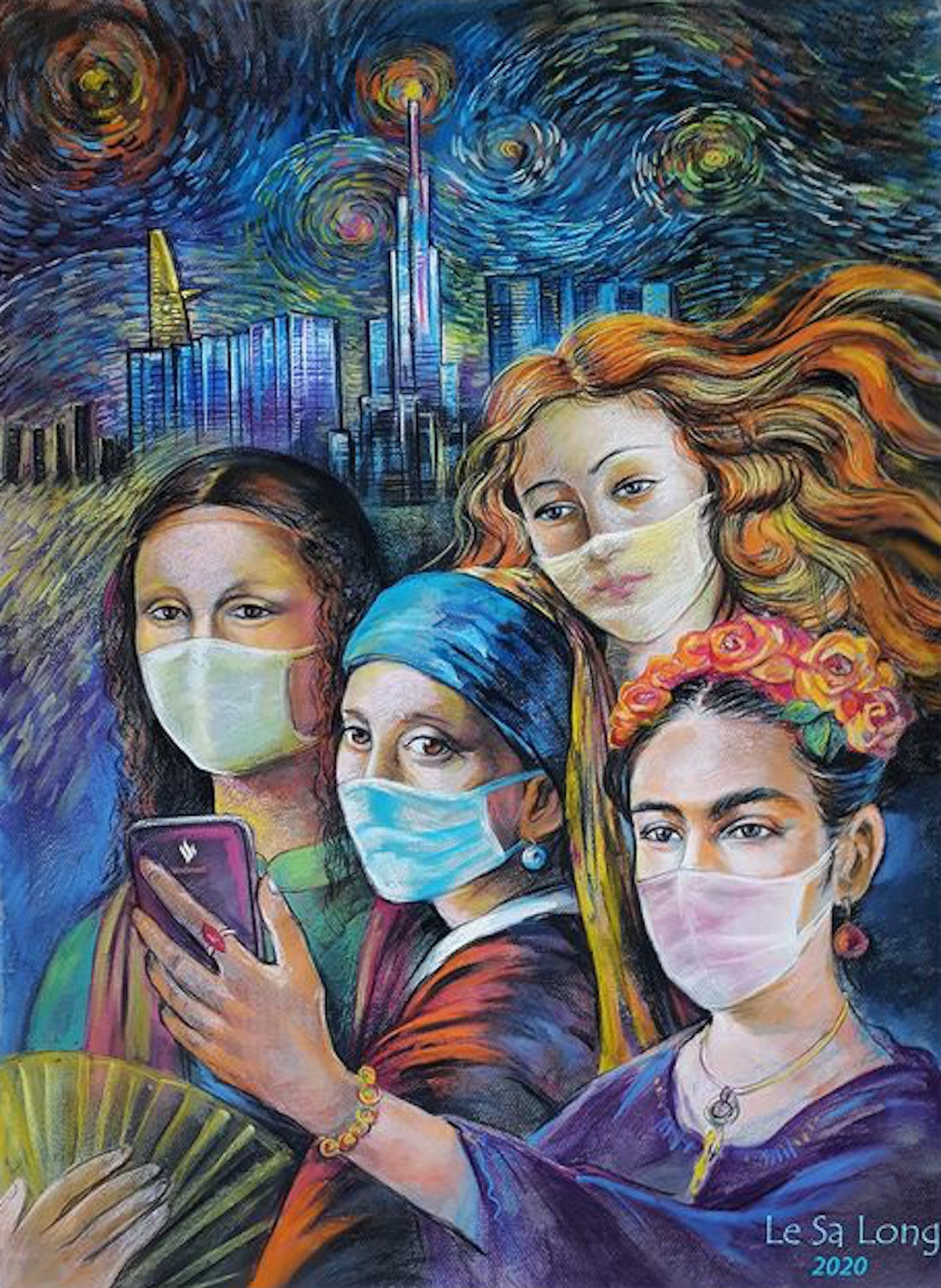 Đáng chú ý trong bộ tranh sẽ có bức tranh của 4 Mỹ nhân nổi tiếng nhất trong lịch sử Mỹ thuật thế giới là Mona Lisa (La Joconde) của danh họa Leonardo da Vinci vẽ khoảng năm 1503; Thần Vệ nữ sinh ra từ biển (Birth of Venus) của danh họa Sandro Botticelli vẽ năm 1486; Thiếu nữ đeo hoa tai ngọc trai (Girl With A Pearl Earring) do danh hoạ Johannes Vermeer vẽ vào thế kỷ 17 và hiện vẫn được coi là kiệt tác trong “thời kỳ hoàng kim Hà Lan” và mỹ nhân thứ tư là người thật: Nữ họa sĩ người Mehico Frida Kahlo (1907 - 1954). 4 Mỹ nữ sẽ đeo khẩu trang, cùng làm dáng trên đường phố Sài Gòn với sau lưng là toà nhà Landmark 81- Toà nhà cao nhất TP.