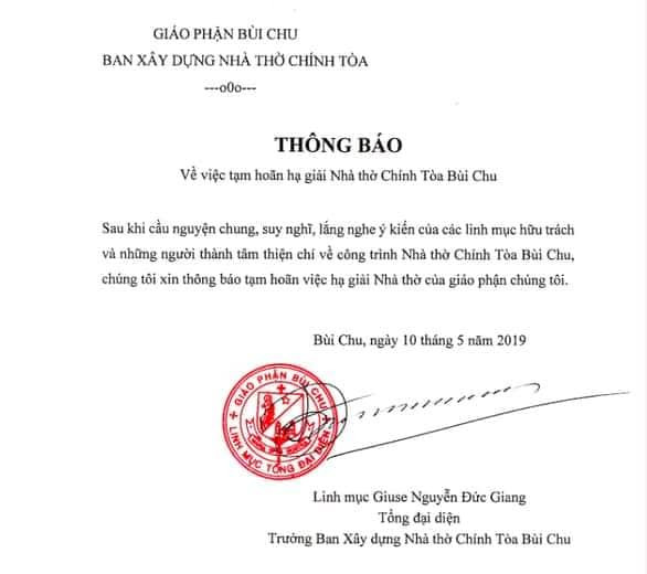 Linh mục Giuse Nguyễn Đức Giang, Tổng đại diện Giám phận Bùi Chu, Trưởng Ban Xây dựng Nhà thờ Chính toà Bùi Chu ký văn bản thông báo về việc này.