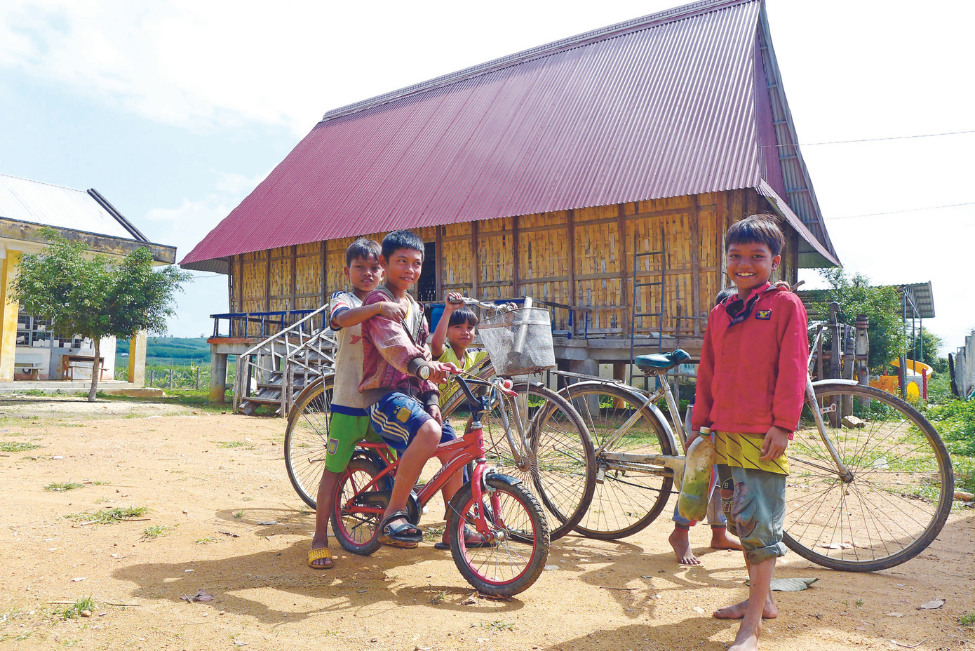 Tôi tìm về làng Pơ Nang, Bên nhà rông trụ bê tông lợp tôn đỏ ngay cổng làng, mấy đứa trẻ Bahnar đang đạp xe đùa nghịch. Da đen cháy, tóc râu ngô, mắt sáng, như mọi đứa trẻ nơi cao nguyên.