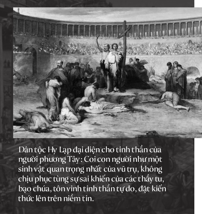 Trong các dân tộc sống ở thời kỳ cổ đại, dân tộc Hy Lạp đại diện cho tinh thần của người phương Tây. Người Hy Lạp ca ngợi con người như một sinh vật quan trọng nhất của vũ trụ và không chịu phục tùng sự sai khiến của các thầy tu, bạo chúa hay kiêm nhường thần thánh. Họ tôn vinh tinh thần tự do tìm kiếm và đặt kiến thức lên trên niềm tin. Chính tư tưởng này đã đưa nền văn minh Hy Lạp lên đỉnh cao nhất trong thế giới cổ đại.