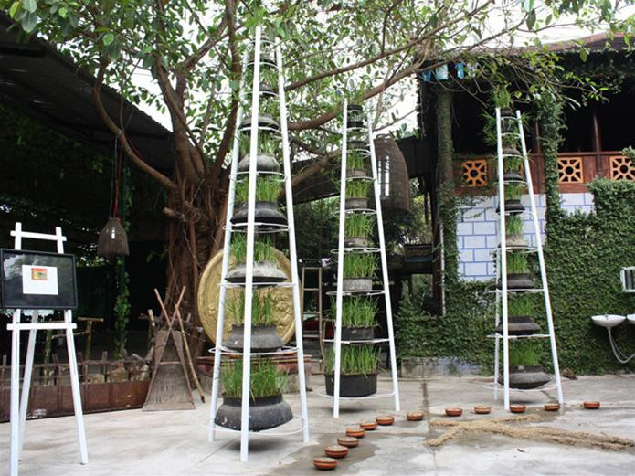 Triển lãm lần này được thực hiện tại Khu du lịch sinh thái Tích Tường, thị xã Quảng Trị, từ ngày 28-2 đến 11-3. Tác giả sử dụng 3 tháp bằng sắt hình chóp nón, mỗi tháp có chín tầng và 9 nồi đồng cổ từ nhỏ đến lớn; trong mỗi nồi đồng được gieo nhiều cây mạ non (ảnh).