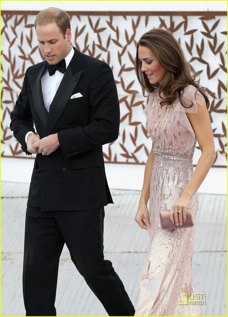 Chiếc váy thướt tha đính pha lê Swarovski này nằm trong bộ sưu tập Xuân 2011 của Jenny Packham đã làm nổi bật lên vẻ đẹp dịu dàng và thanh lịch của Kate. Kết hợp với giày cao gót của LK Bennet và các phụ kiện đơn giản nhưng hết sức sang trọng, Kate tự tin sánh bước bên hoàng tử Williams cũng rất chau chuốt trong bộ vest đen lịch lãm.