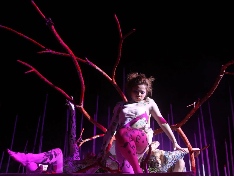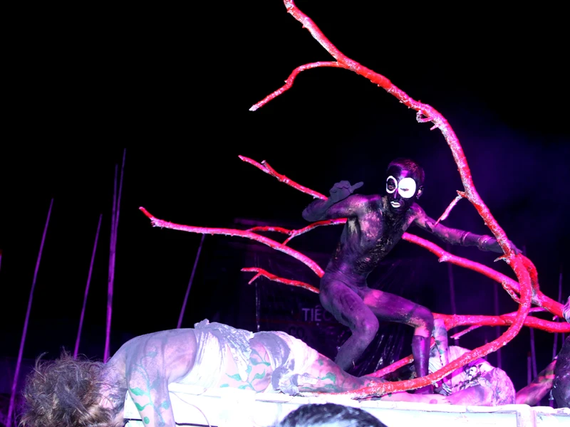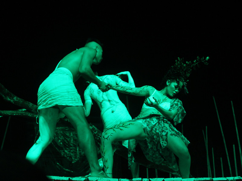 Sự trong lành, xanh tươi ban đầu vốn bao trùm toàn bộ thiên nhiên, còn ô nhiễm rất ít ỏi. Khán giả có thể đo đếm được: năm nghệ sĩ hóa trang thành những mầm xanh, trọn kín cơ thể là sắc trắng; một diễn viên trọn kín màu đen – ô nhiễm – “bó chân” trong cũi.