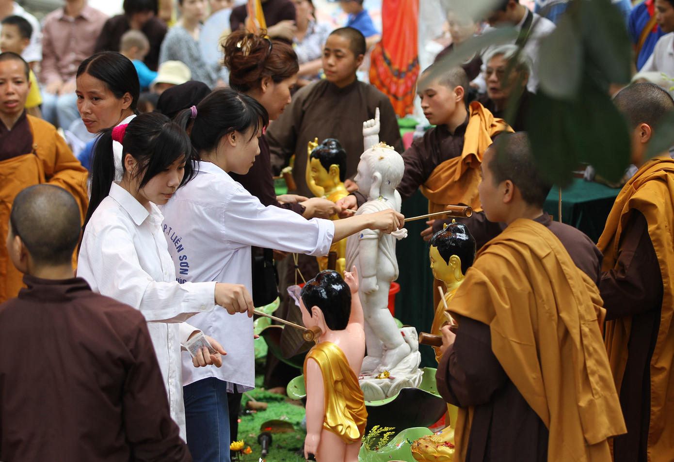 | Sau khi đã tắm cho Phật, nước thơm trở thành nước thiêng được mọi người nâng niu từng giọt mang về nhà. . |