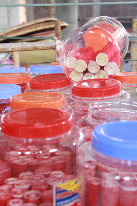 | Các băng giấy in kinh được phết nước thơm, phơi khô, cuộn chặt, bỏ lọ để yểm tầng cao của tháp. |