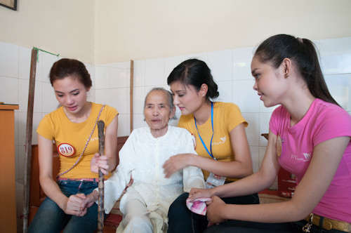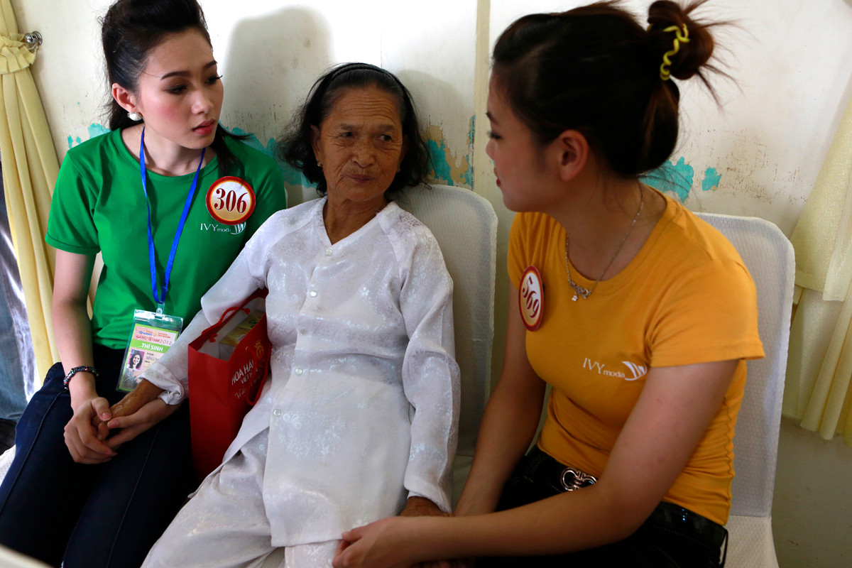 Tổng Biên tập báo Tiền Phong Lê Xuân Sơn (bên phải) cùng các thí sinh Hoa hậu thăm hỏi cụ Sửu, người 104 tuổi tại trung tâm Chăm sóc những người có công. Ảnh: Hồng Vĩnh
