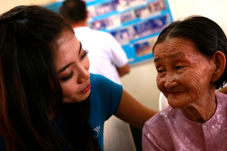 Thí sinh Vũ Ngọc Anh bên cụ bà nhiều tuổi nhất tại trung tâm Chăm sóc người có công. Ảnh: Công Khanh
