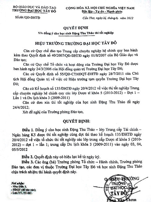 Công văn từ phía trường ĐH Tây Đô ghi rõ: "Do Thảo có nguyện vọng thi Hoa hậu Việt Nam, em Thảo đã có đơn xin dự thi tốt nghiệp Trung cấp trước hạn so với các bạn cùng lớp và Trường đã đồng ý cho Thảo được thi tốt nghiệp vào đợt tháng 5-2012 cùng với các lớp trung cấp Dược sĩ khóa 5 (2010 - 2012) - Đợt 1 - Lần 1; Trung cấp Du lịch khóa 3 (2009 - 2011). Sau khi thi và có kết quả đạt tốt nghiệp Trung cấp, Thảo đã đăng ký thi liên thông từ trung cấp lên cao đẳng và trúng tuyển vào ngành Kế toán vào tháng 6-2012".
